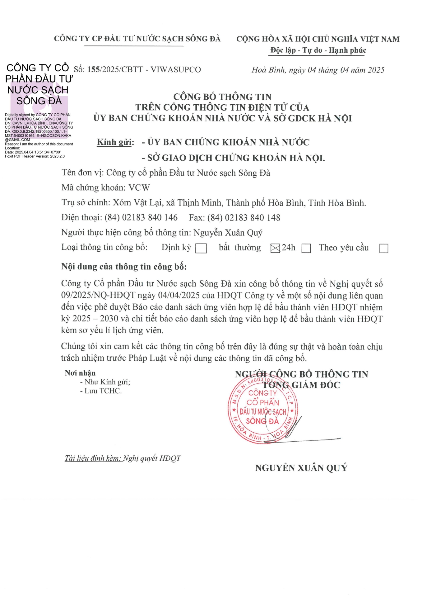 Để xem chi tiết CBTT Danh sách ứng viên hợp lệ bầu Thành viên HĐQT nhiệm kỳ 2025 - 2030, xin vui lòng mở file đính kèm, trân trọng cảm ơn !