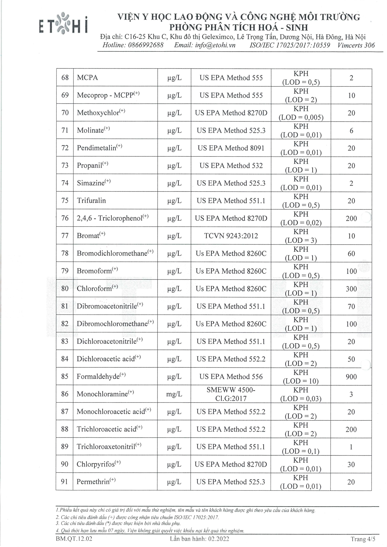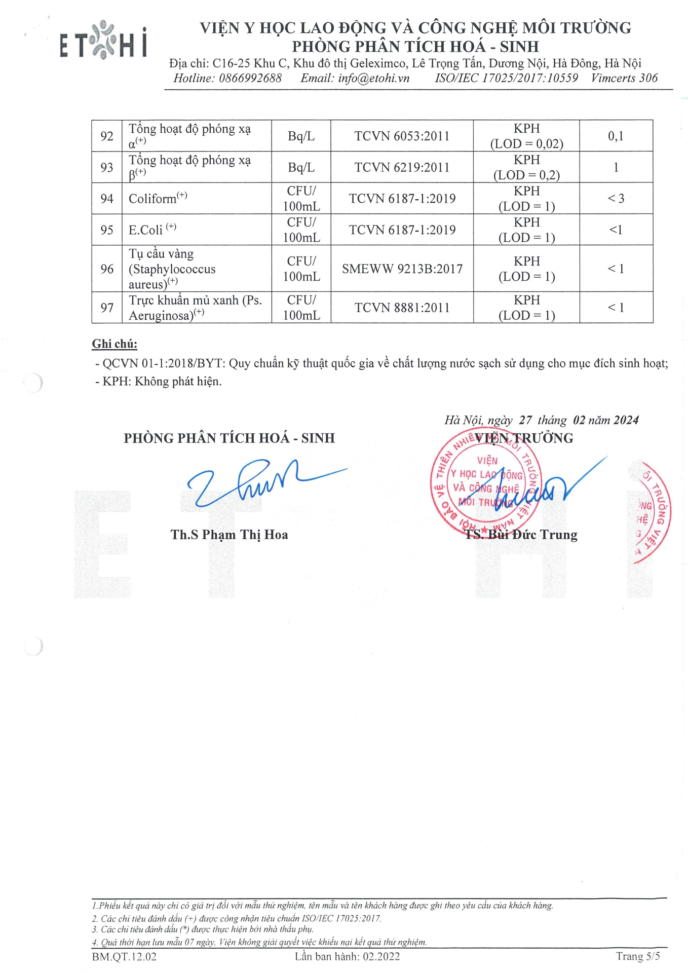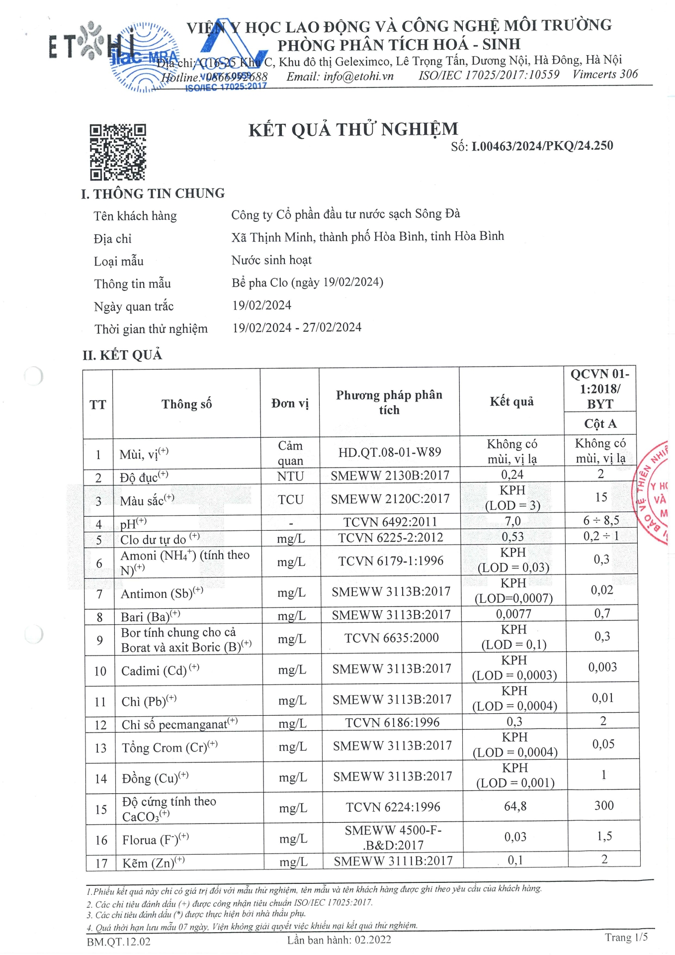 Chỉ tiêu chất lượng nước tháng 02/2024 đã qua thử nghiệm (Nước sinh hoạt - Bể pha clo; ngày lấy mẫu: 19/02/2024) Tên FileNgày đăngTải vềket-qua-thu-nghiem-vien-y-hoc-lao-dong-t2-2024.pdf28/03/2024