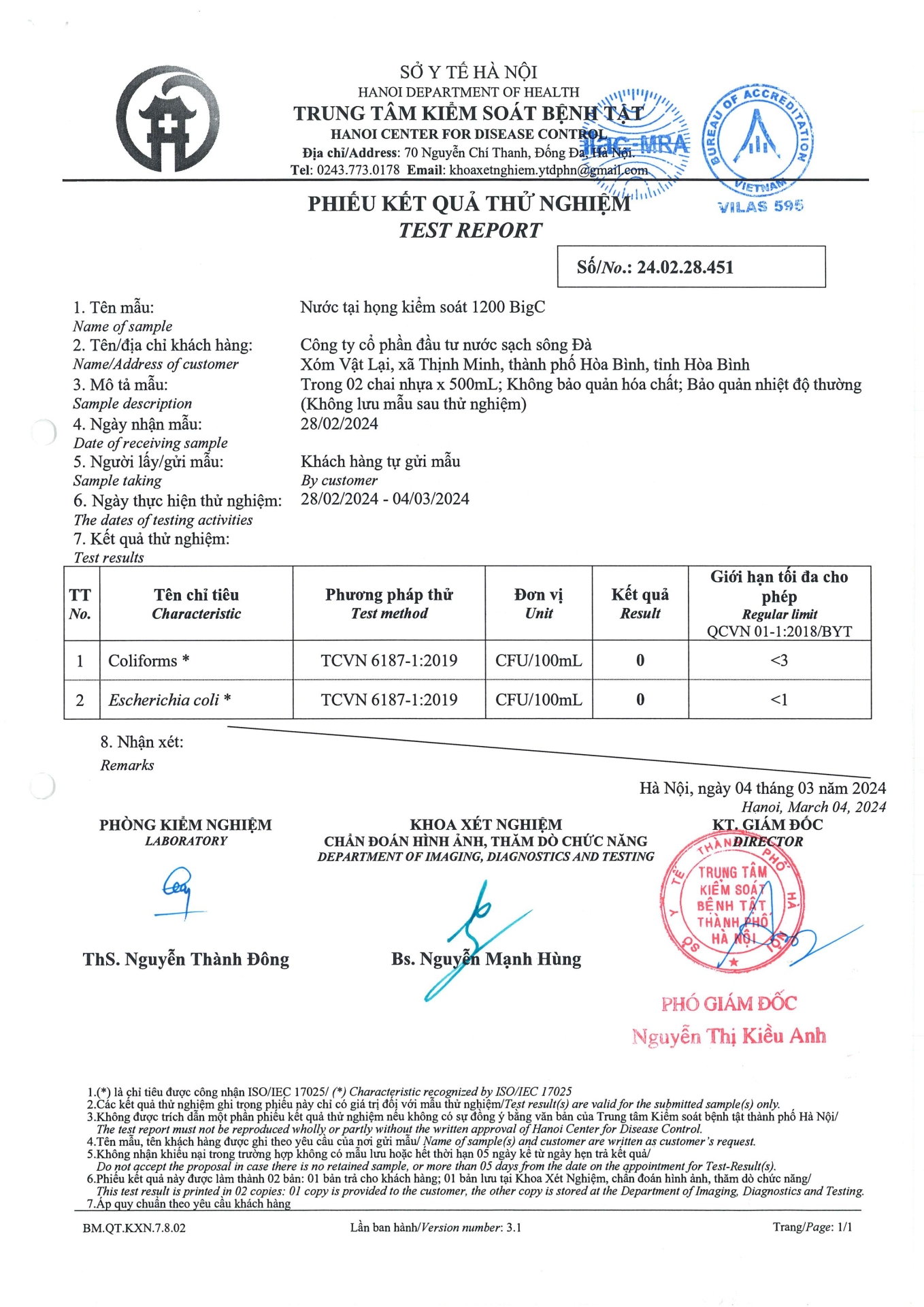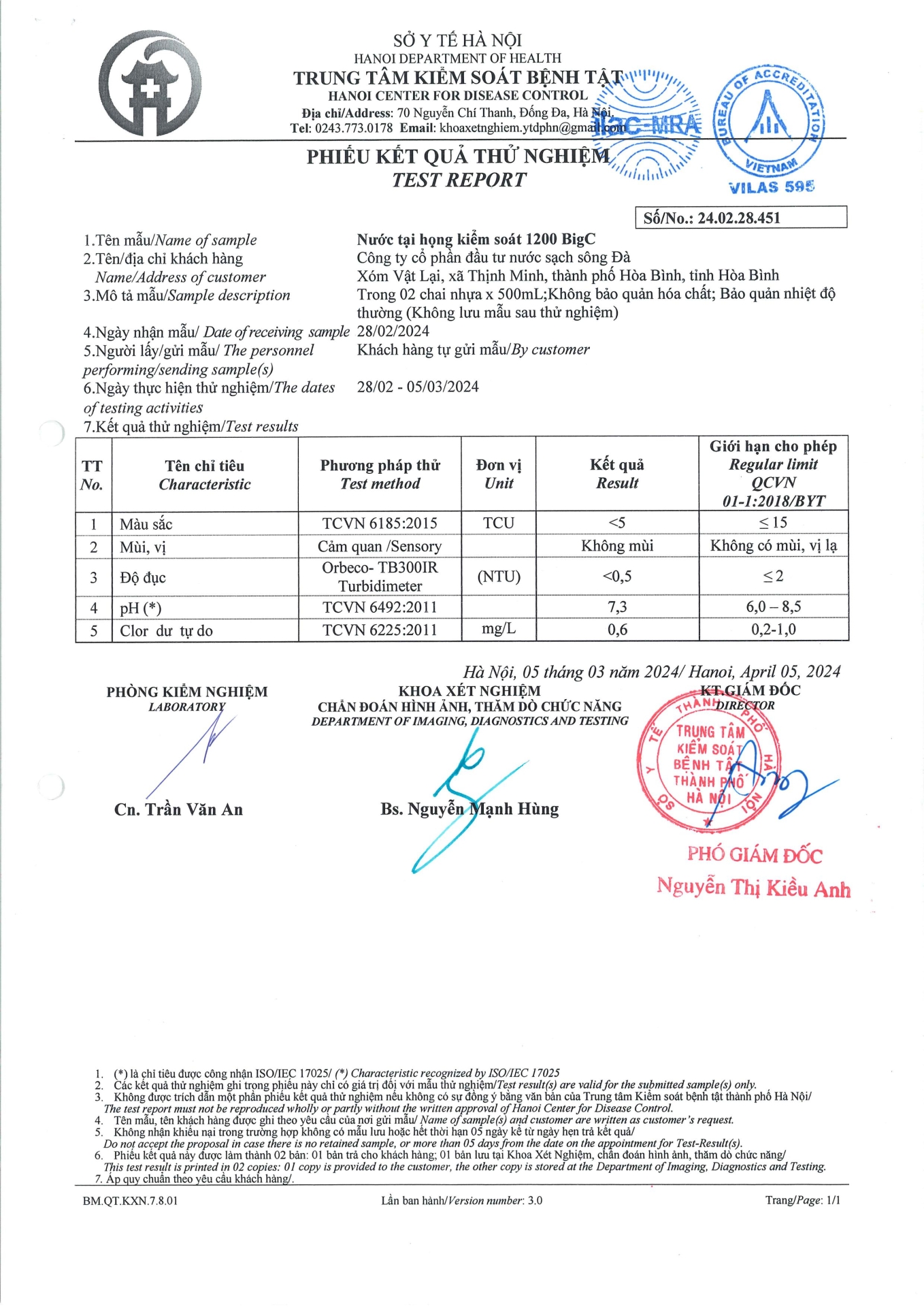Chỉ tiêu chất lượng nước tháng 02/2024 đã qua thử nghiệm (Nước sinh hoạt - họng nước tại BigC, ngày lấy mẫu 28/02 - 05/03/2024) Tên FileNgày đăngTải về0003-t2-2.pdf28/03/2024