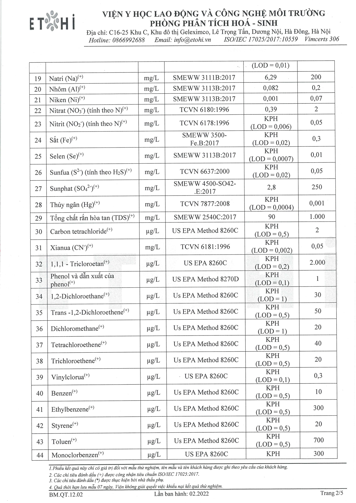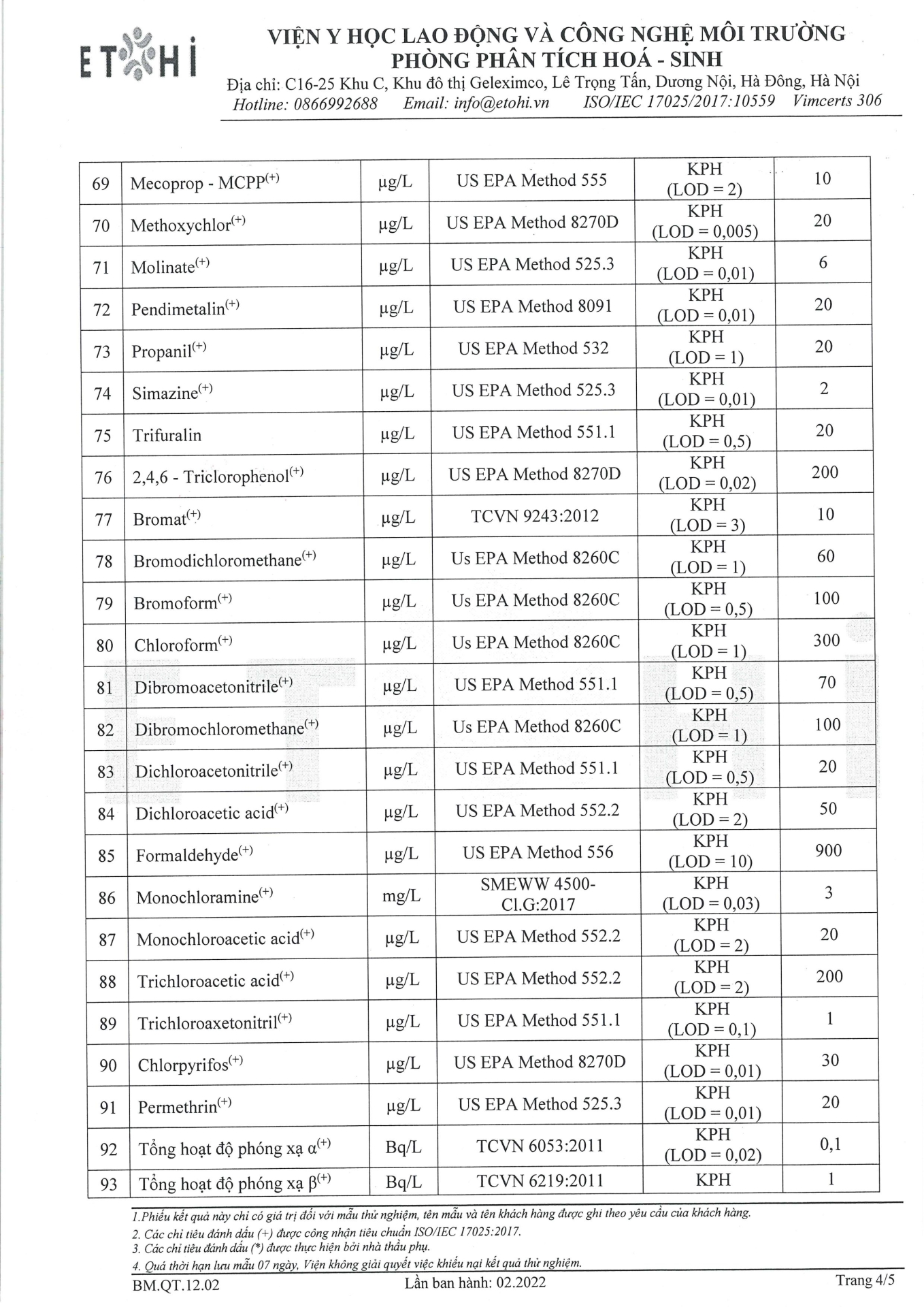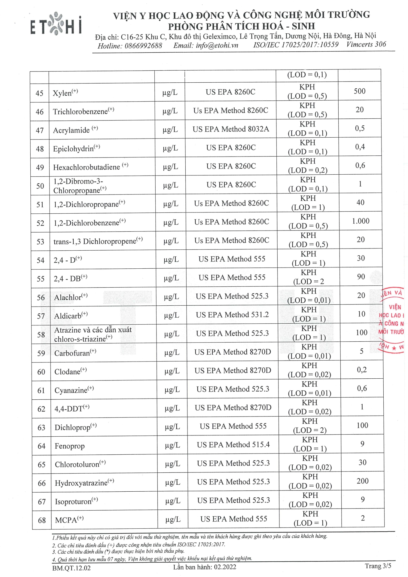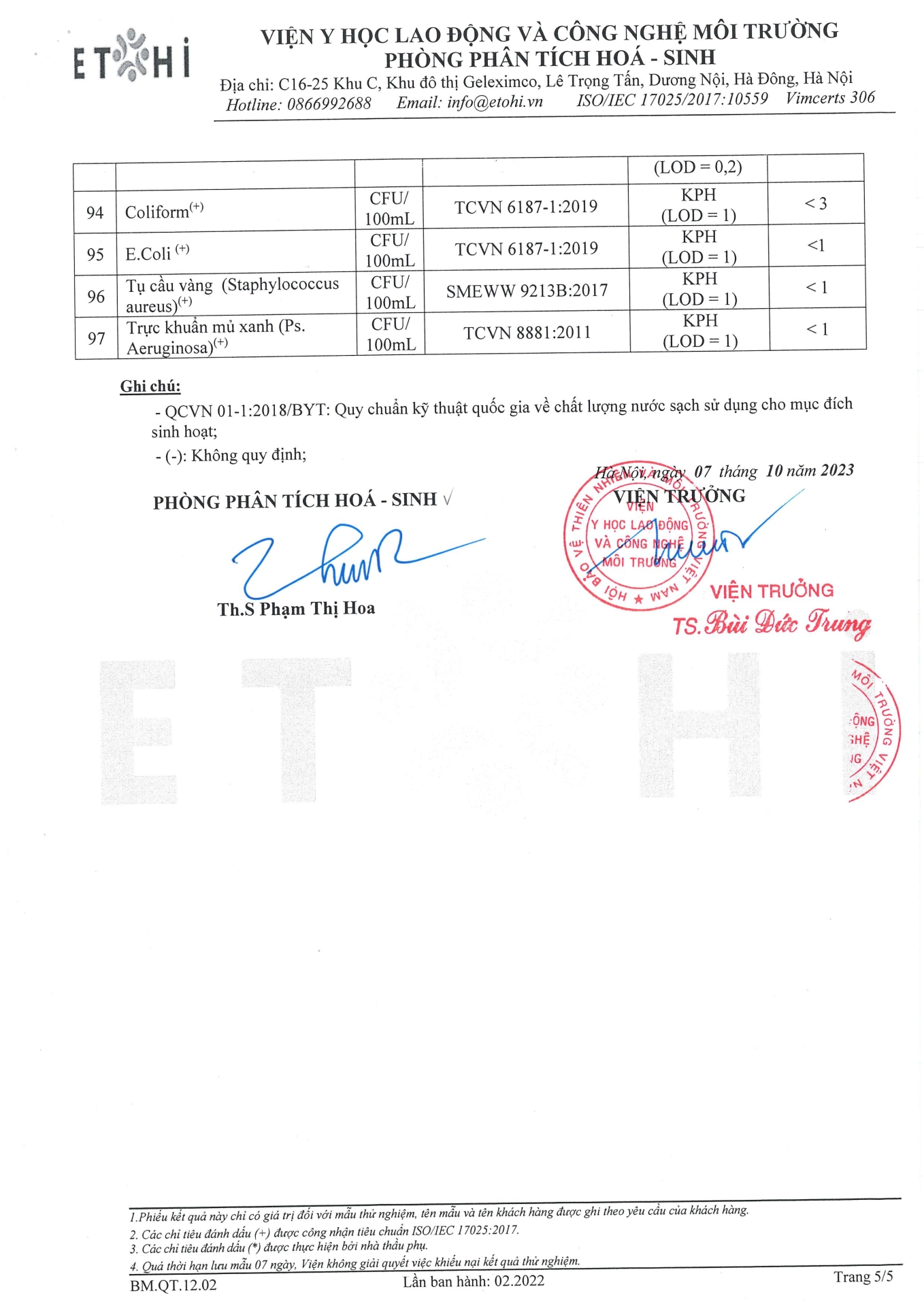 Chỉ tiêu chất lượng nước tháng 09/2023 đã qua thử nghiệm (Nước sinh hoạt tại bể pha clo) Tên FileNgày đăngTải vềkqxn-nuoc-sach-thang-9.pdf30/10/2023