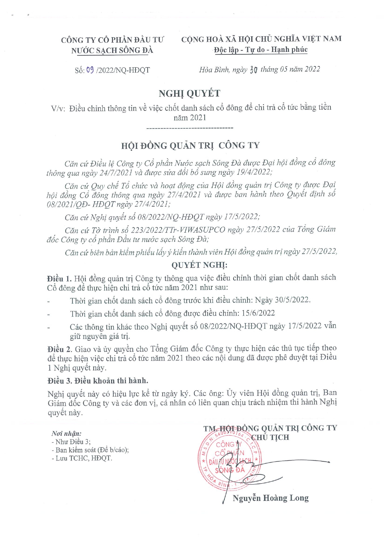 Công bố đính chính thông tin về ngày đăng ký cuối cùng chốt danh sách cổ đông để trả cổ tức năm 2021