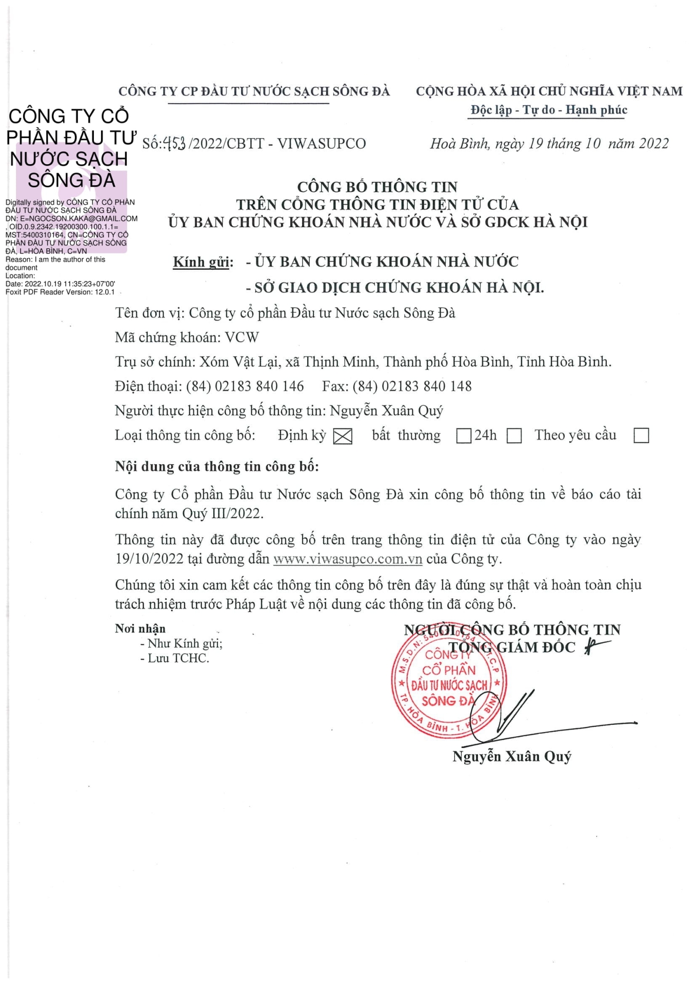 Công bố thông tin Báo cáo Tài chính Quý 3/2022Công bố thông tin Báo cáo Tài chính Quý 3/2022 Để xem chi tiết Báo cáo tài chính Quý 3/2022, xin vui lòng mở file đính kèm, cảm ơn...!453- CBTT.pdf Tải xuống