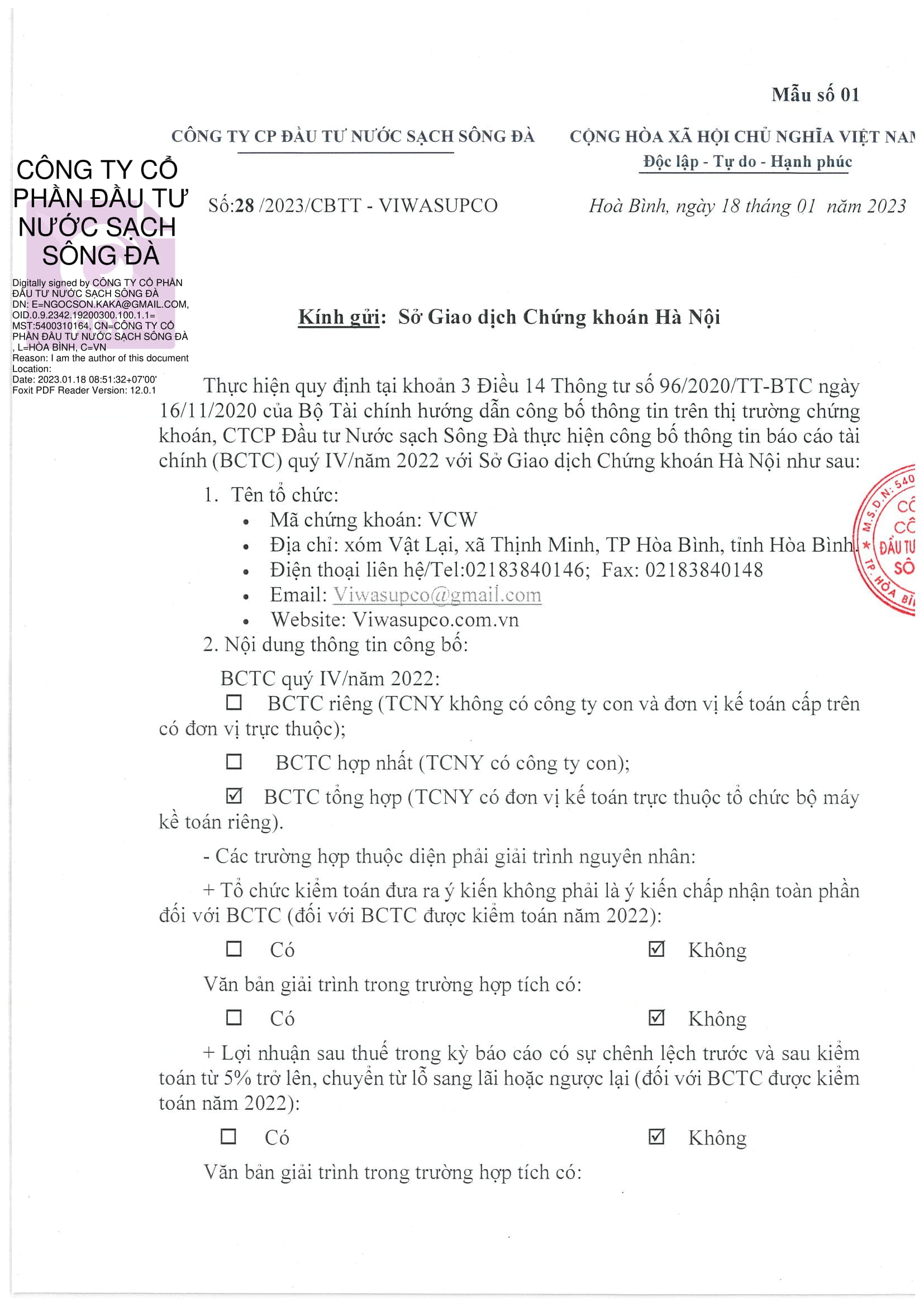 Công bố thông tin Báo cáo Tài chính Quý IV năm 202211:53 - 18/01/2023Báo cáo tài chính, Lượt xem: 1581Công bố thông tin Báo cáo Tài chính Quý IV năm 2022 Để xem chi tiết Báo cáo tài chính Quý IV năm 2022, xin vui lòng mở file đính kèm, cảm ơn...! Báo cáo Tài chính Quy IV-2022.pdfChia sẻ: