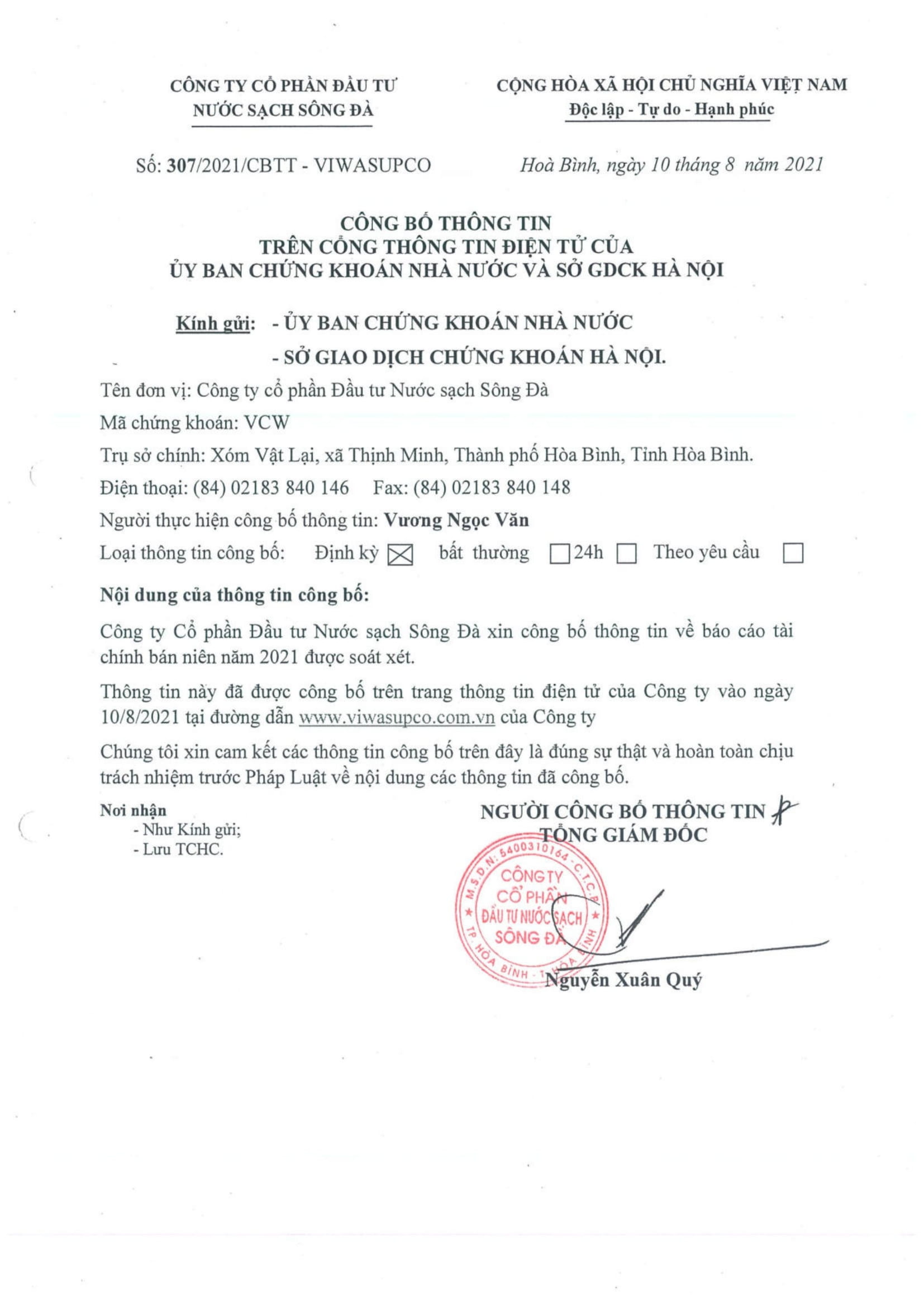 Công bố thông tin về Báo cáo tài chính bán niên năm 2021 được soát xét