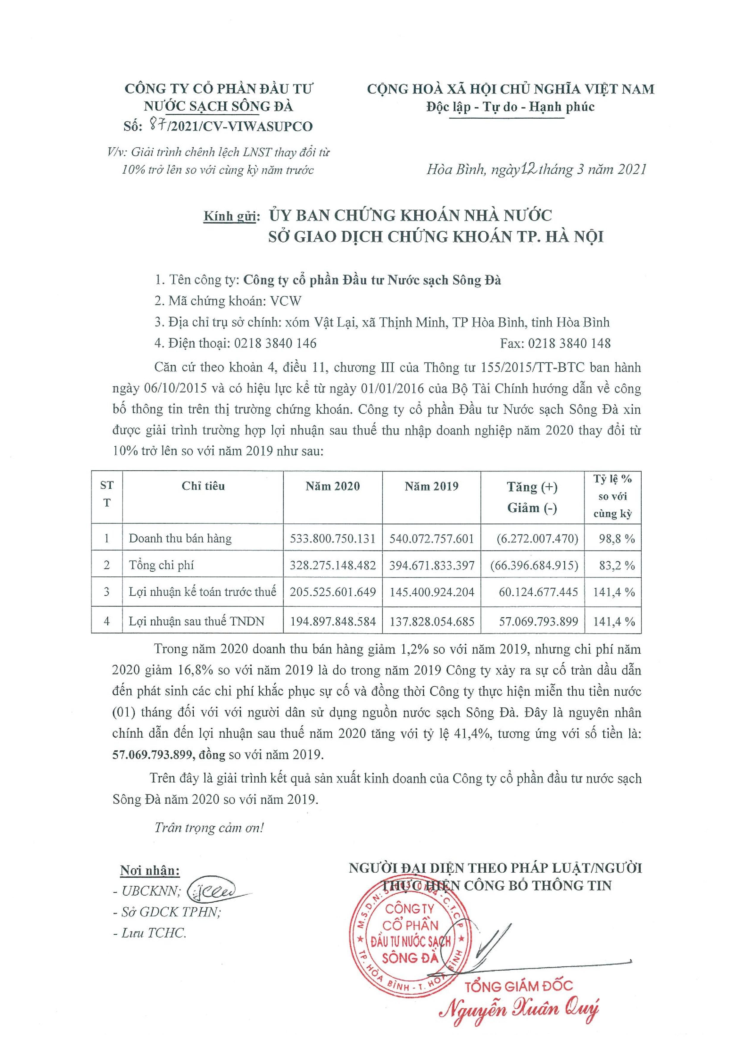 Công ty cổ phần Đầu tư Nước sạch Sông Đà trân trọng gửi tới Quý cổ đông Giải trình chênh lệch từ 10% trở lên LNST so với cùng kỳ năm trước và Báo cáo Tài chính kết thúc ngày 31 tháng 12 năm 2020.