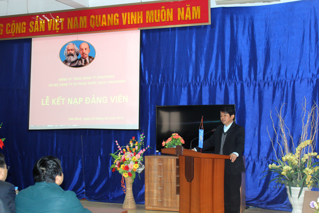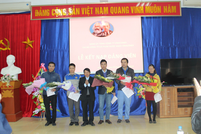Sáng ngày 03/02/2015, tại Hội trường Công ty cổ phần Nước sạch VINACONEX Chi bộ Công ty cổ phần Nước sạch VINACONEX đã tổ chức trọng thể Lễ kết nạp Đảng viên cho 05 đồng chí gồm: Đồng chí Vũ Đức Toản – Phó Giám đốc Ban Kỹ thuật; Đồng chí Trần Văn Tiển – Phó Giám đốc Ban Kỹ thuật; Đồng chí Nguyễn Thị Vân Anh – Chuyên viên ban Tài chính Kế toán; Đồng chí Phí Văn Chiến – Phụ trách Trạm bơm Nước Sông; đồng chí Nguyễn Văn Khang – Công nhân trạm bơm Nước Sông vào Đảng cộng sản Việt Nam: