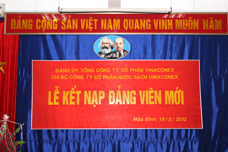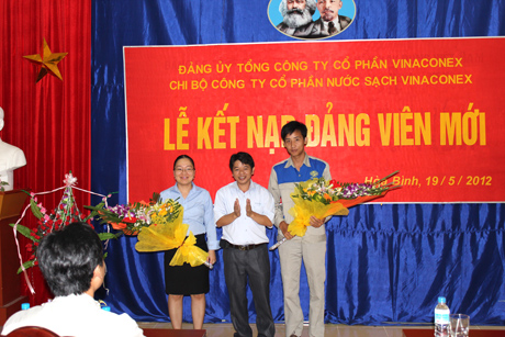 Sáng ngày 19/05/2012, tại Hội trường Công ty cổ phần Nước sạch VINACONEX, Chi bộ Công ty cổ phần Nước sạch VINACONEX đã tổ chức trọng thể Lễ kết nạp Đảng viên cho 02 đồng chí Bùi Thị Vũ Anh – Chuyên viên Ban Tài chính kế toán và đồng chí Nguyễn Phú Giang – Phó phụ trách Đội Bể chứa và tuyến ống vào Đảng cộng sản Việt Nam: