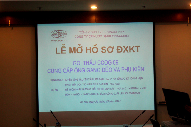 Chiều ngày 30/9/2015, tại Phòng họp tầng 21 phòng 2108 Trụ sở Tổng Công ty cổ phần Vinaconex – 34 Láng Hạ - Đống Đa – Hà Nội, Công ty cổ phần Nước sạch Vinaconex – Chủ đầu tư Dự án: Hệ thống cấp nước chuỗi đô thị Sơn Tây – Hòa Lạc – Xuân Mai – Miếu Môn – Hà Nội – Hà Đông giai đoạn 2, nâng công suất lên 600.000m3/ngđ đã tổ chức Lễ mở thầu Gói thầu: CCO-G09 Cung cấp ống Gang và Phụ kiện Tuyến ống truyền tải nước sạch dài 21 Km từ cọc 327 (Cổng viện phim) đến cọc 750 (Cầu chui dân sinh Km9+656).
