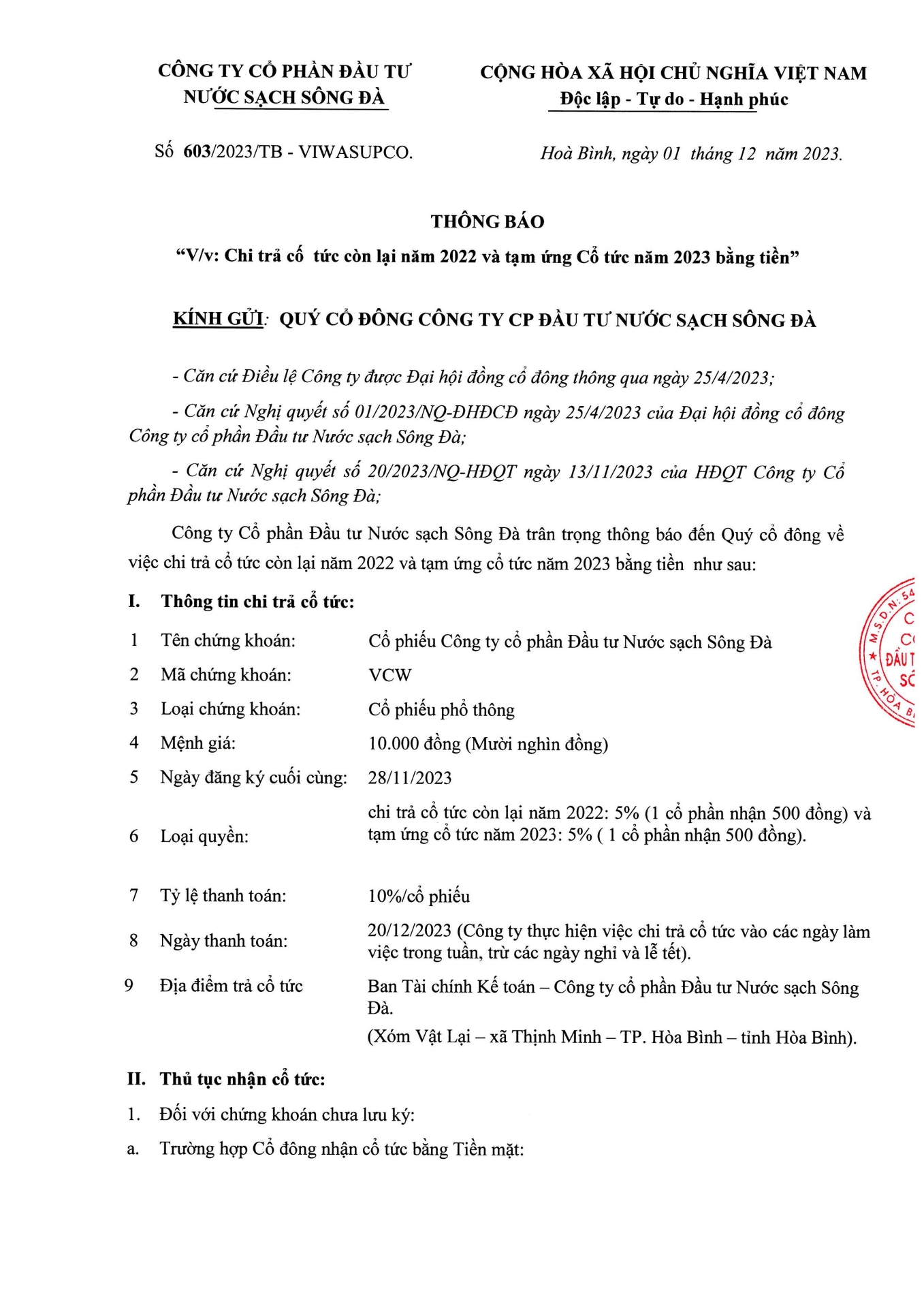 Thông báo Chi trả cổ tức năm 2022 và tạm ứng cổ tức năm 2023