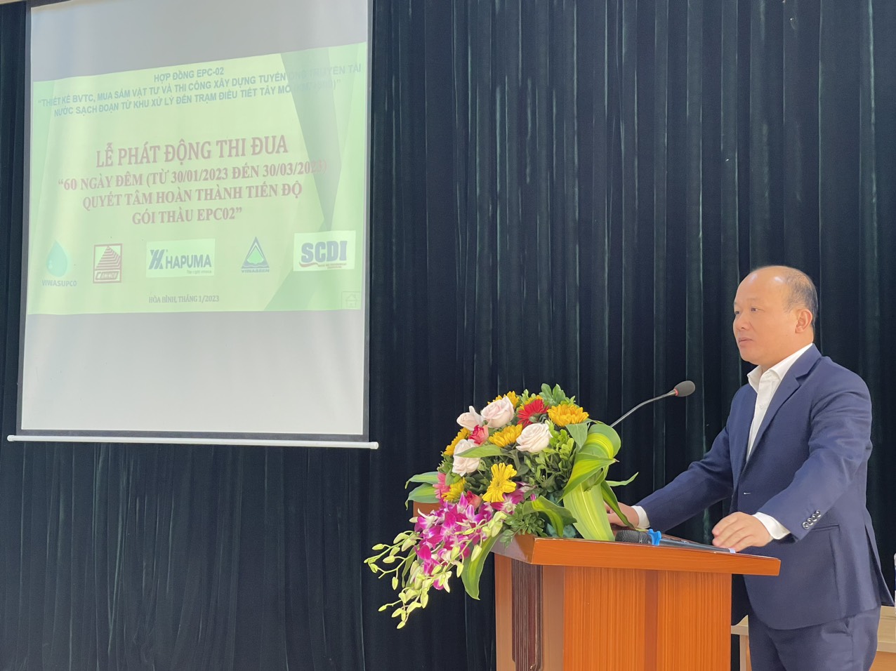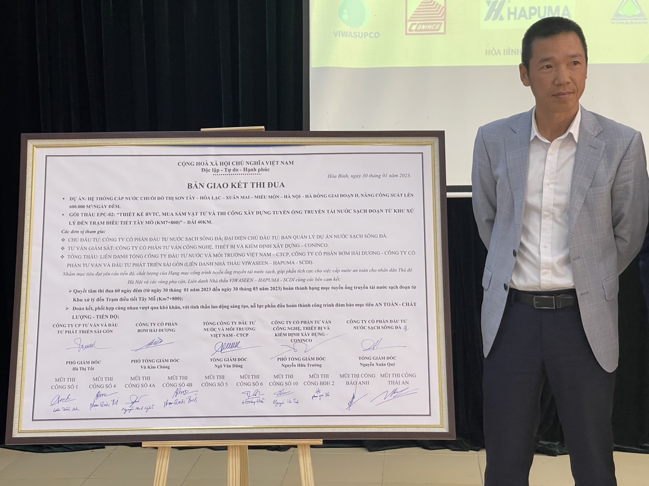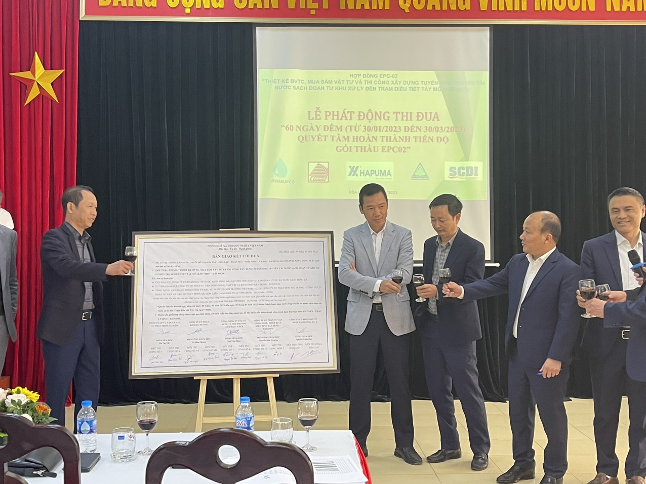 Được sự đồng ý của Lãnh đạo Tập đoàn, Công ty Cổ phần Hạ tầng Gelex, hôm nay chủ đầu từ Công ty Cổ phần Đầu tư nước sạch Sông Đà – Viwasupco tổ chức lễ phát động thi đua “60 ngày đêm” quyết tâm hoàn thành tiến độ thi công Gói thầu EPC-02 - Thiết kế bản vẽ thi công, mua xắm vật tư và thi công xây dựng tuyến ống truyền tải nước sạch Giai đoạn II dài 40 km (từ khu xử lý đến trạm điều tiết lưu lượng Tây Mỗ km7 + 800).