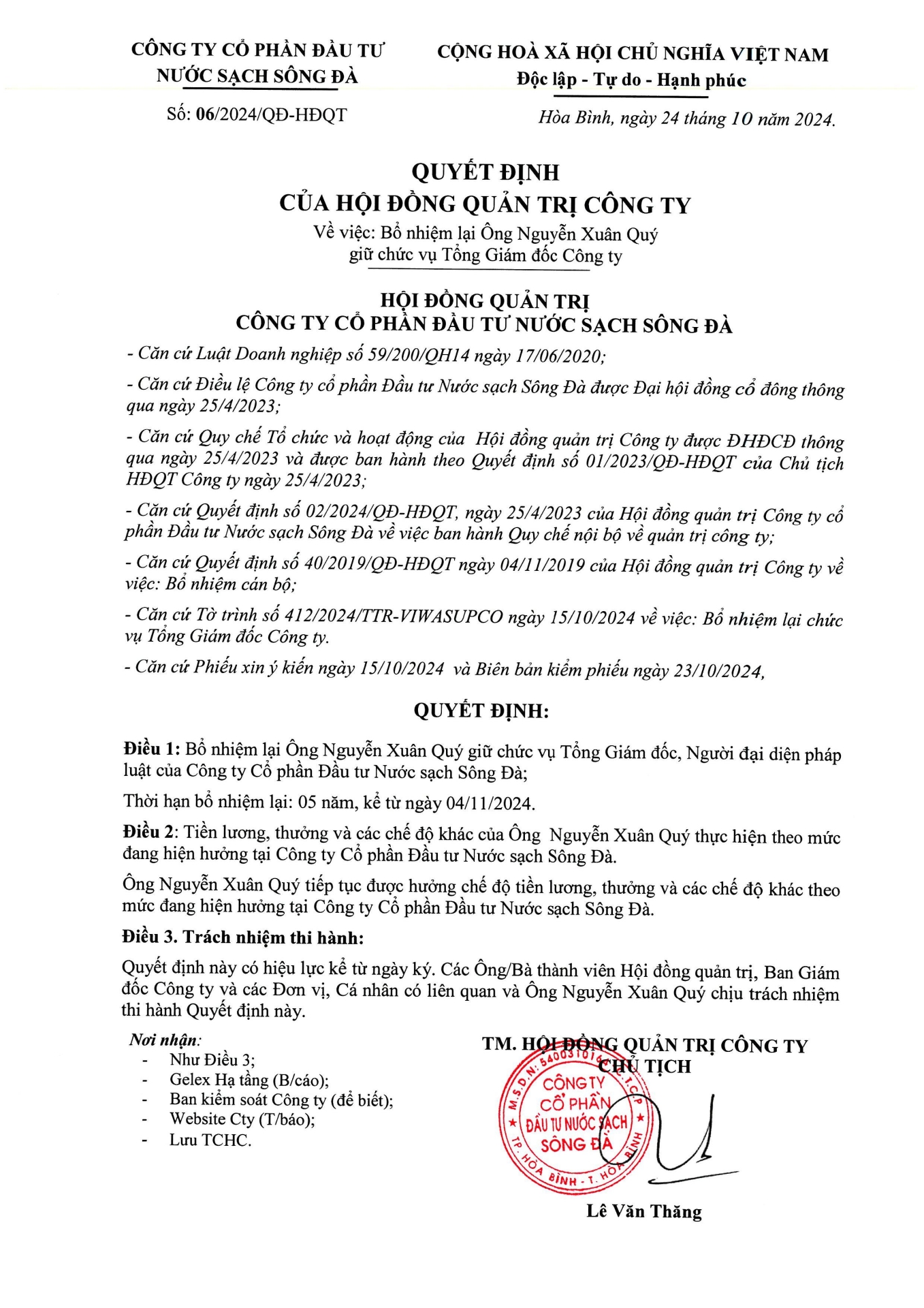 CBTT: Quyết định V/v Bổ nhiệm lại ông Nguyễn Xuân Quý giữ chức vụ Tổng Giám đốc Công ty26/10/202Thông tin chung, Lượt xem: 1328 429-cbtt.pdfChia sẻ: