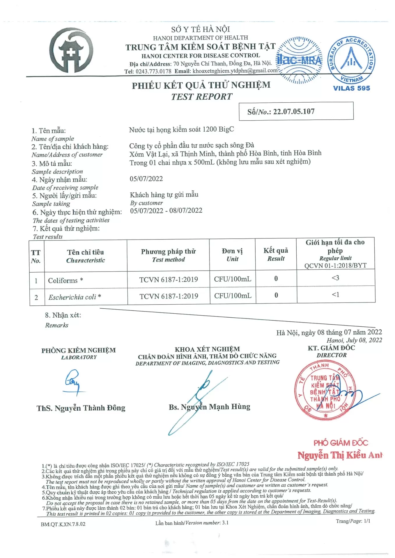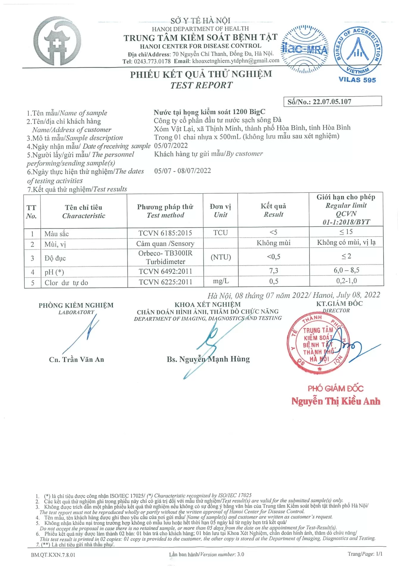 Chi tiêu chất lượng nước tháng 07/2022 đã qua thử nghiệm