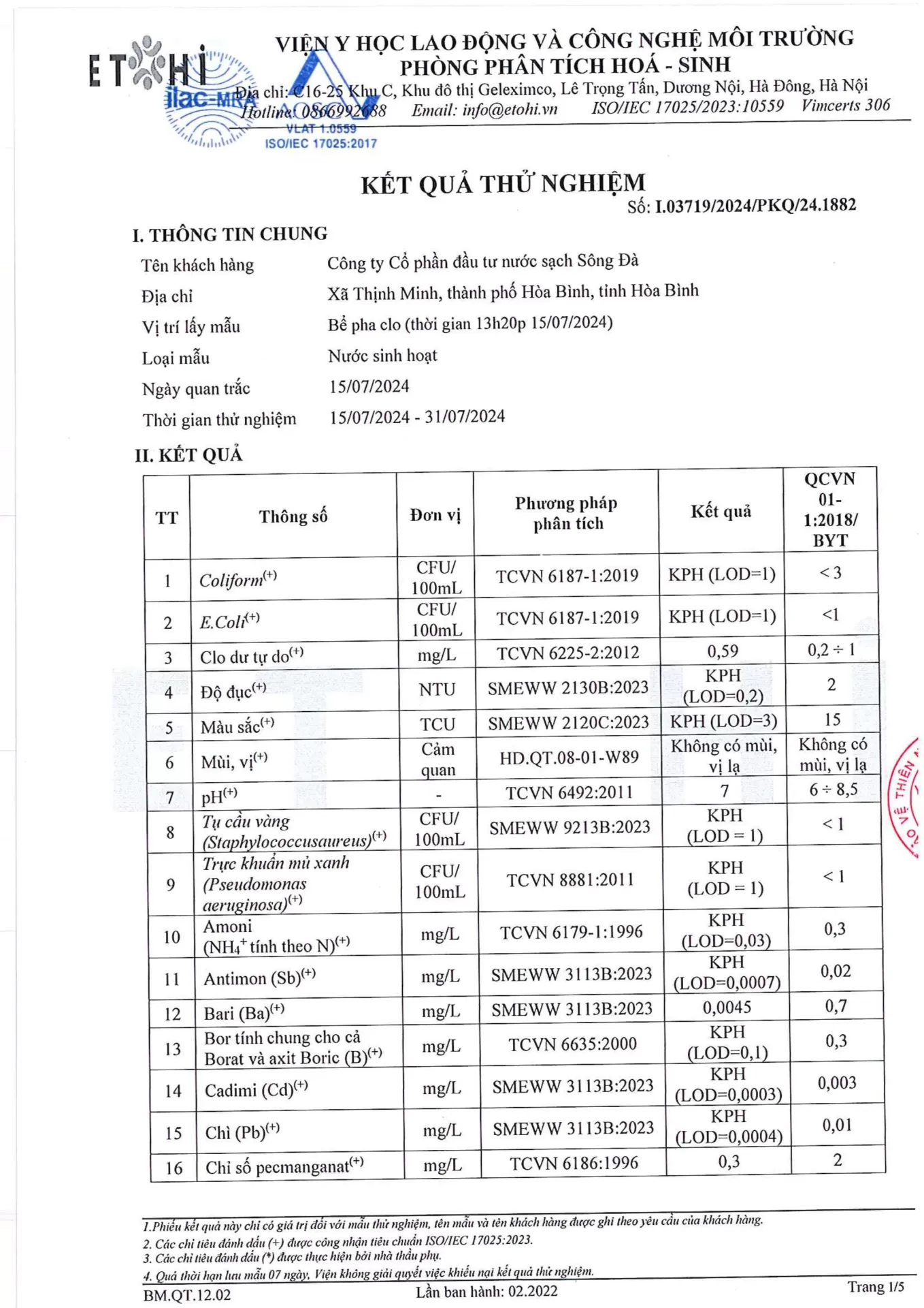 Chỉ tiêu chất lượng nước tháng 07/2024 đã qua thử nghiệm (Nước sinh hoạt - lấy mẫu tại: Bể pha clo - Nhà mày) Tên FileNgày đăngTải vềnsh-15-07.pdf13/08/2024