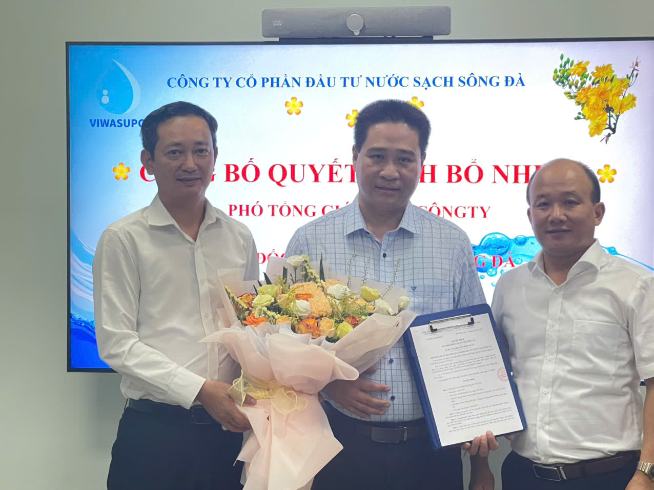 Ông Lê Văn Thăng - Chủ tịch HĐQT và Ông Nguyễn Xuân Quý – TV HĐQT, Tổng Giám đốc Công ty trao Quyết định và tăng hoa chúc mừng ông Nguyễn Tuấn Đan được bổ nhiệm làm Phó Tổng Giám đốc Công ty
