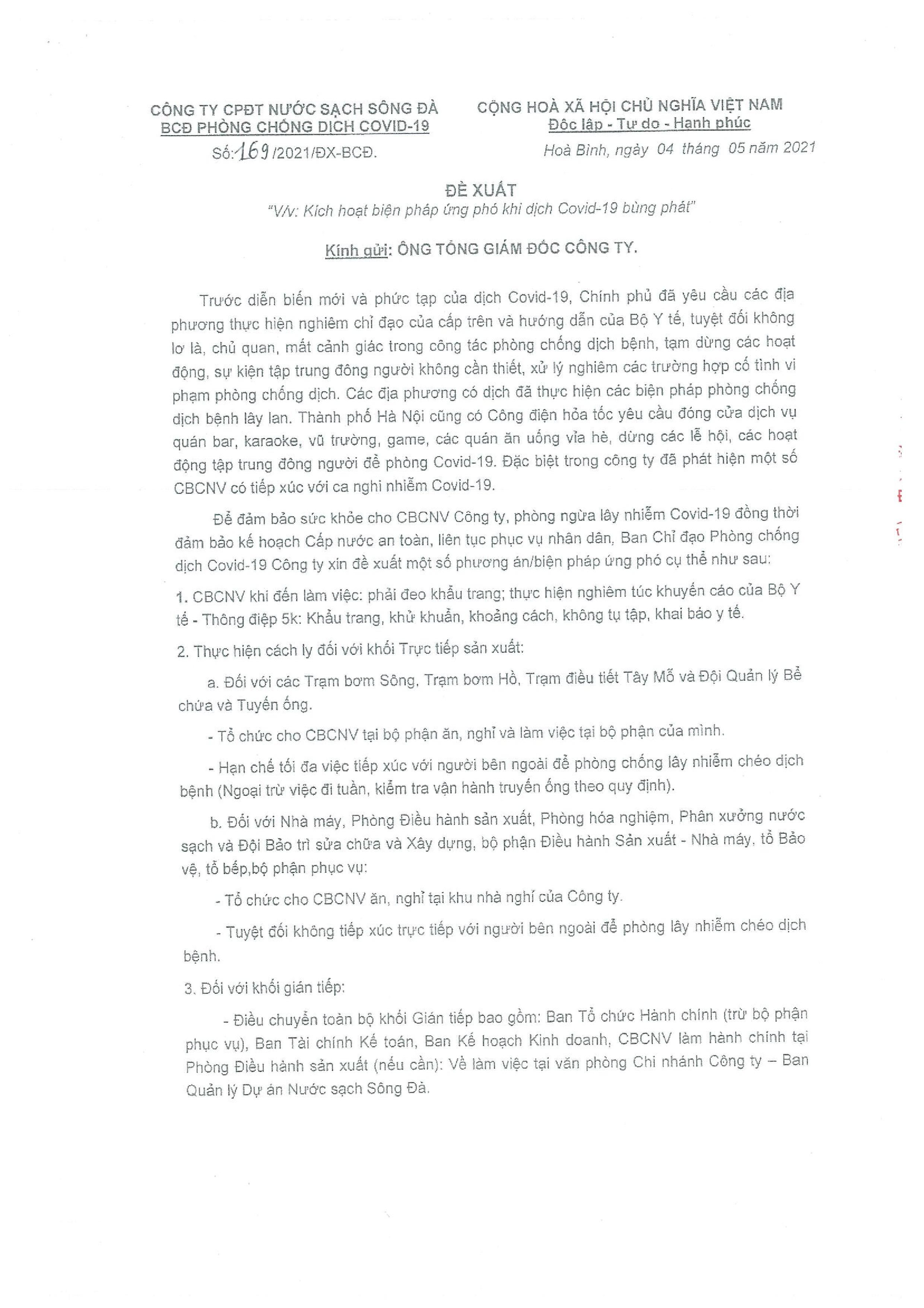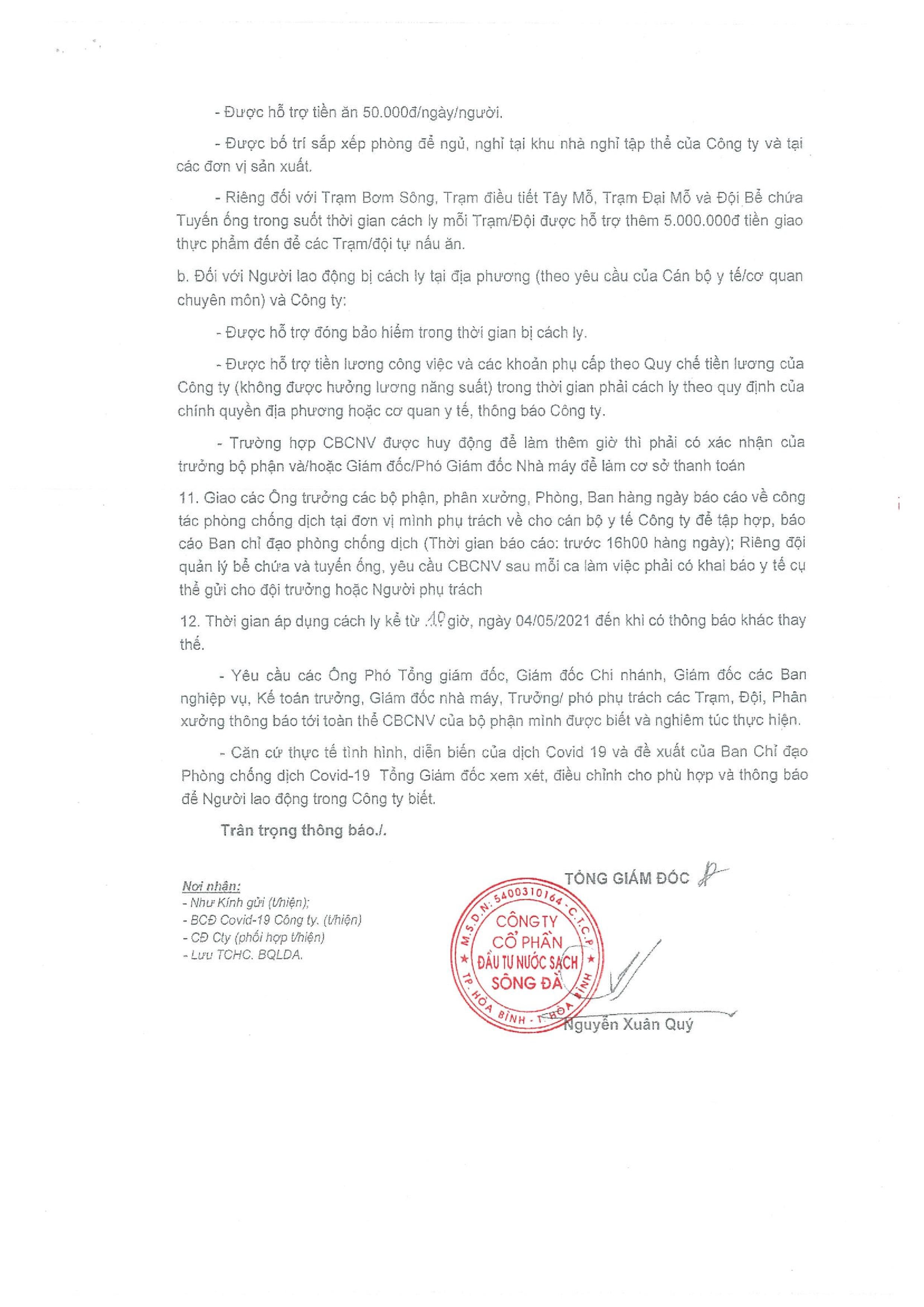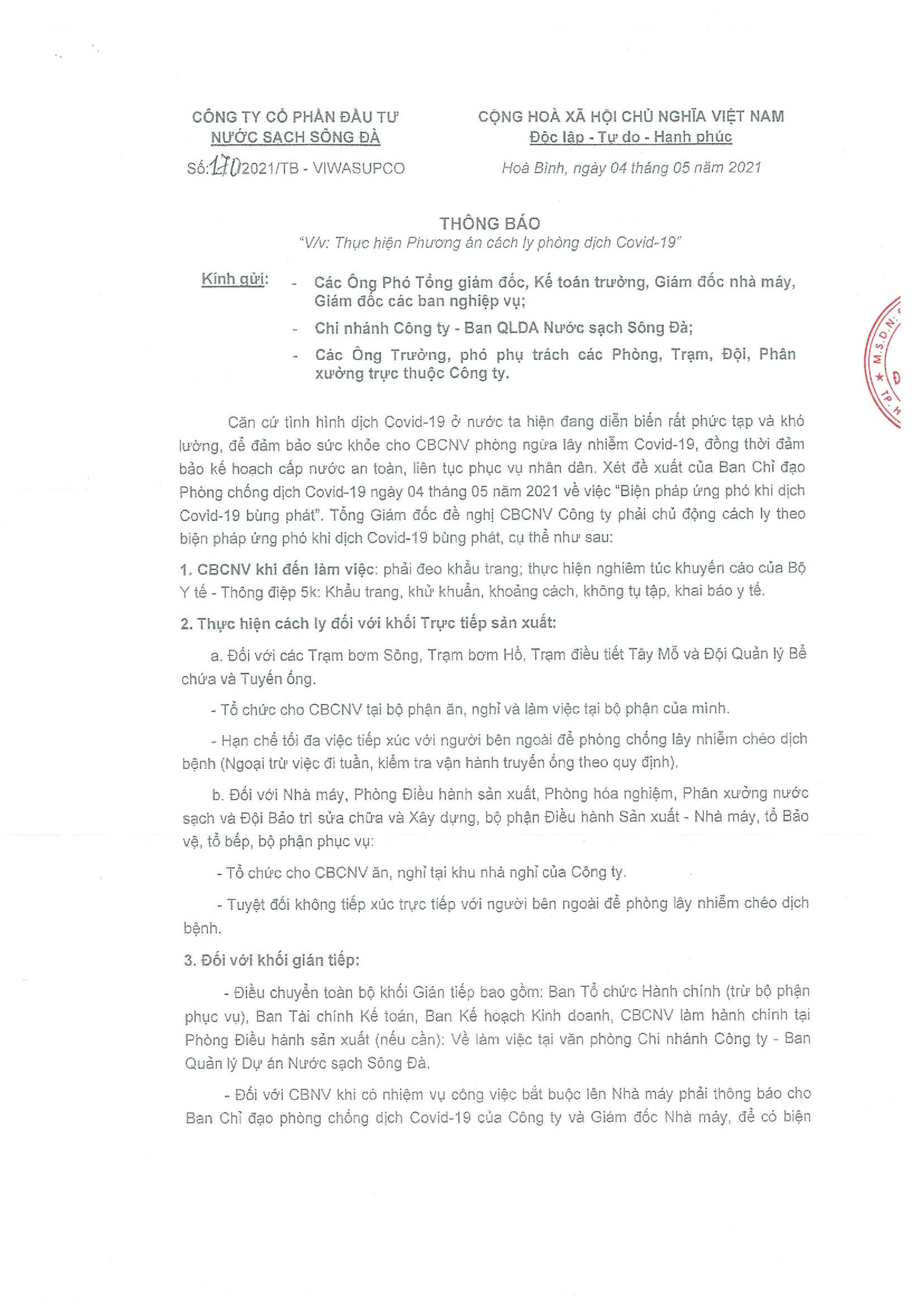 Thông báo về việc: Thực hiện phương án cách ly sản xuất để phòng dịch Covid-19 tại Công ty Cổ phần Đầu tư Nước sạch Sông Đà